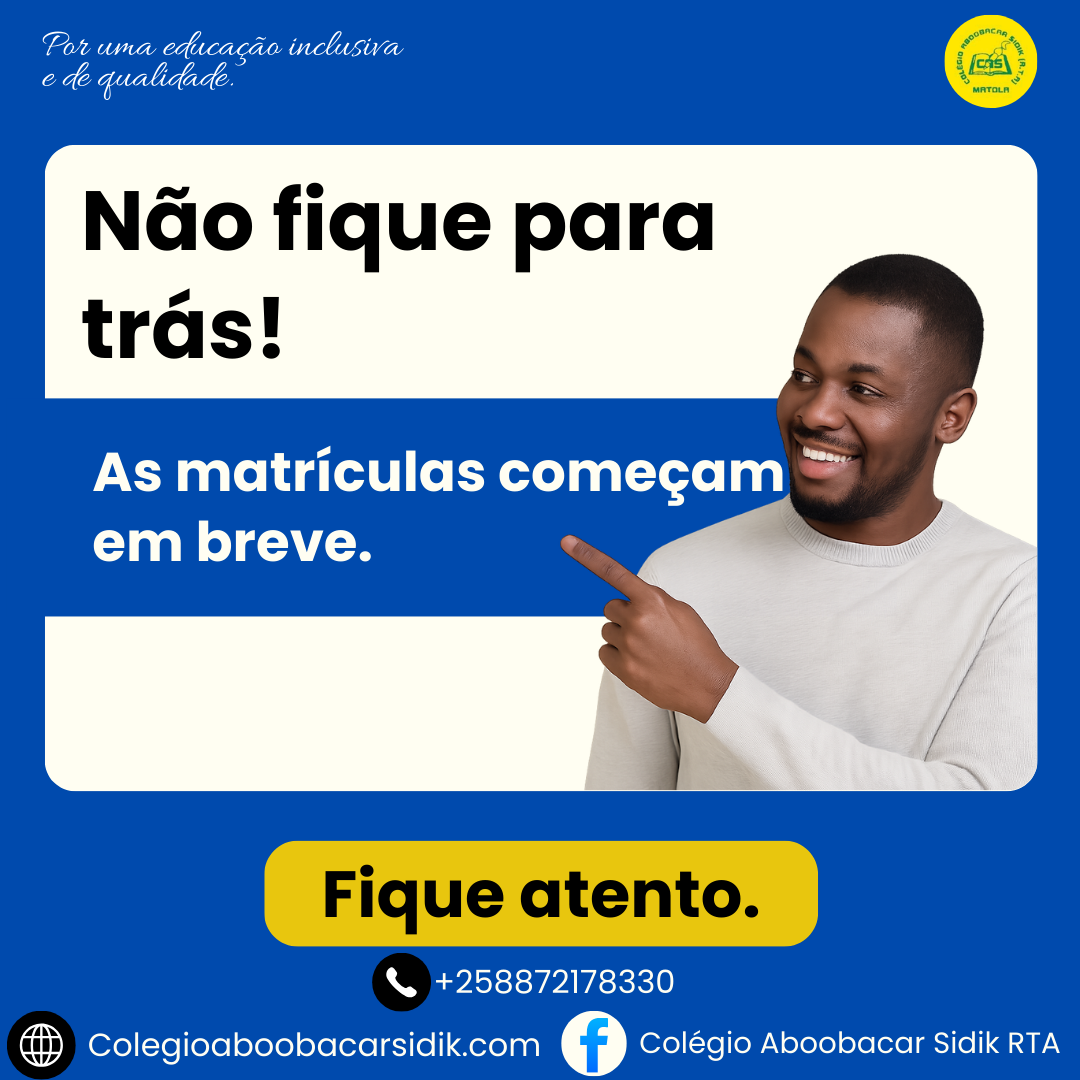 Venha fazer parte da nossa comunidade acadêmica e garanta uma formação de excelência! No Colégio Aboobacar Sidik, valorizamos o aprendizado, o respeito e o desenvolvimento de cada aluno para construir um futuro brilhante.